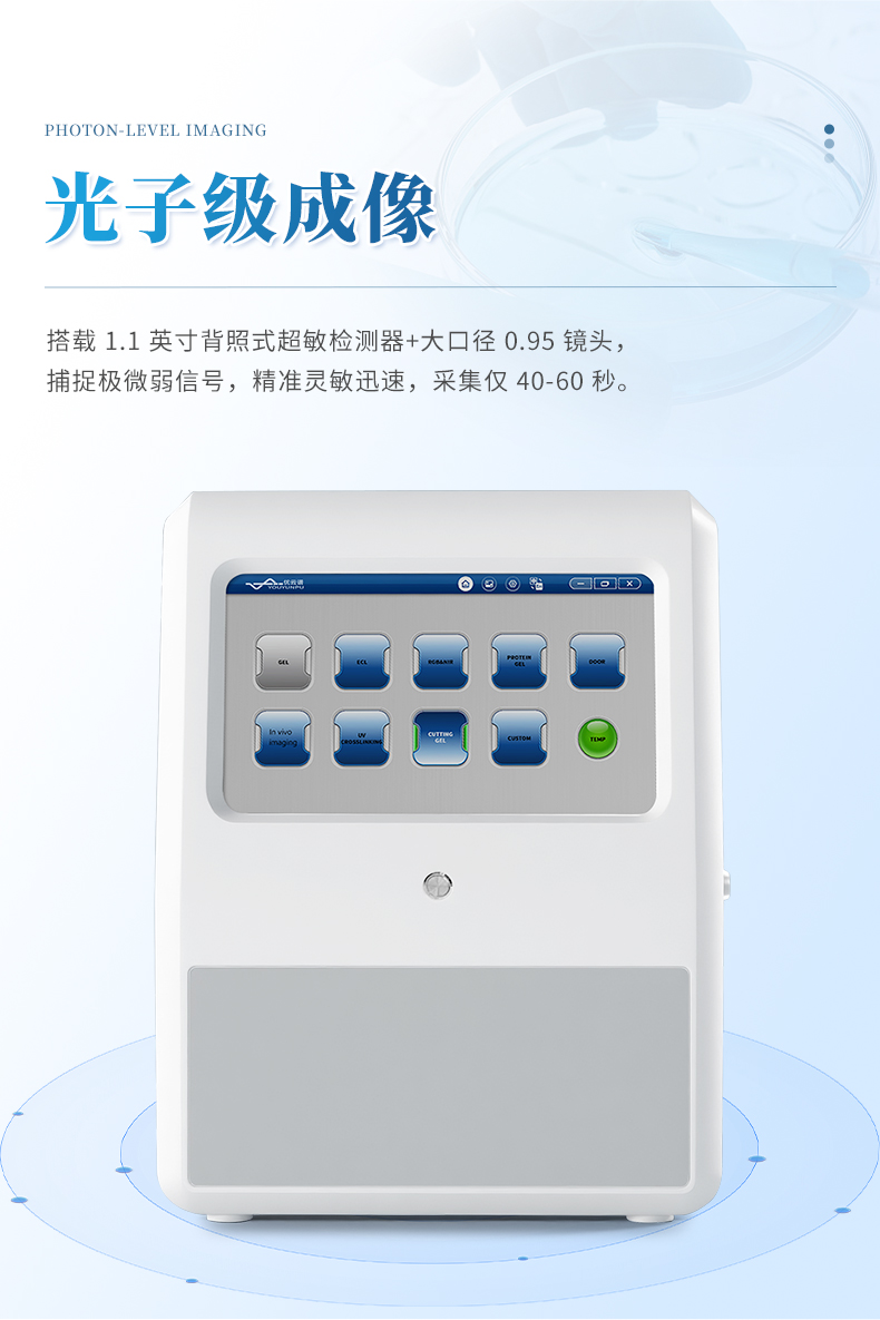 采用獨(dú)特的光子級(jí)成像技術(shù)、超低降噪處理技術(shù),結(jié)合大耙面背照式超敏檢測(cè)器以及大通 光透鏡,使得極微弱信號(hào)捕捉變的更容易。靈敏度遠(yuǎn)超同類(lèi)產(chǎn)品,成像效果更好,采集速 度提升 2-3 倍(原需 2 分鐘,現(xiàn)僅 40-60 秒),避免科研成果錯(cuò)失。我司研發(fā)的新一代 超敏化學(xué)發(fā)光成像系統(tǒng)完全可替代進(jìn)口同類(lèi)產(chǎn)品。