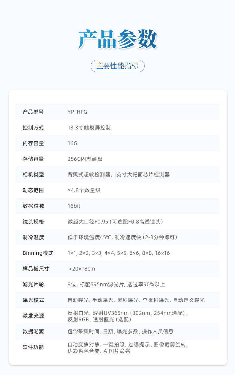 采用 13.3 寸觸摸屏控制,內(nèi)存 16G,256G 固態(tài)硬盤(pán),使儀器具有更強(qiáng)大圖像計(jì)算及 處理能力,配合圖像采集軟件操作簡(jiǎn)捷直觀,軟件具有自動(dòng)采集信號(hào)及彩色 marker,并進(jìn) 行自己處理合成功能;曝光模式分為自動(dòng)曝光、手動(dòng)曝光、累積曝光、總累積曝光以及自 動(dòng)定義曝光功能。配合圖像分析軟件可對(duì)圖像信號(hào)進(jìn)行定性定量分析。