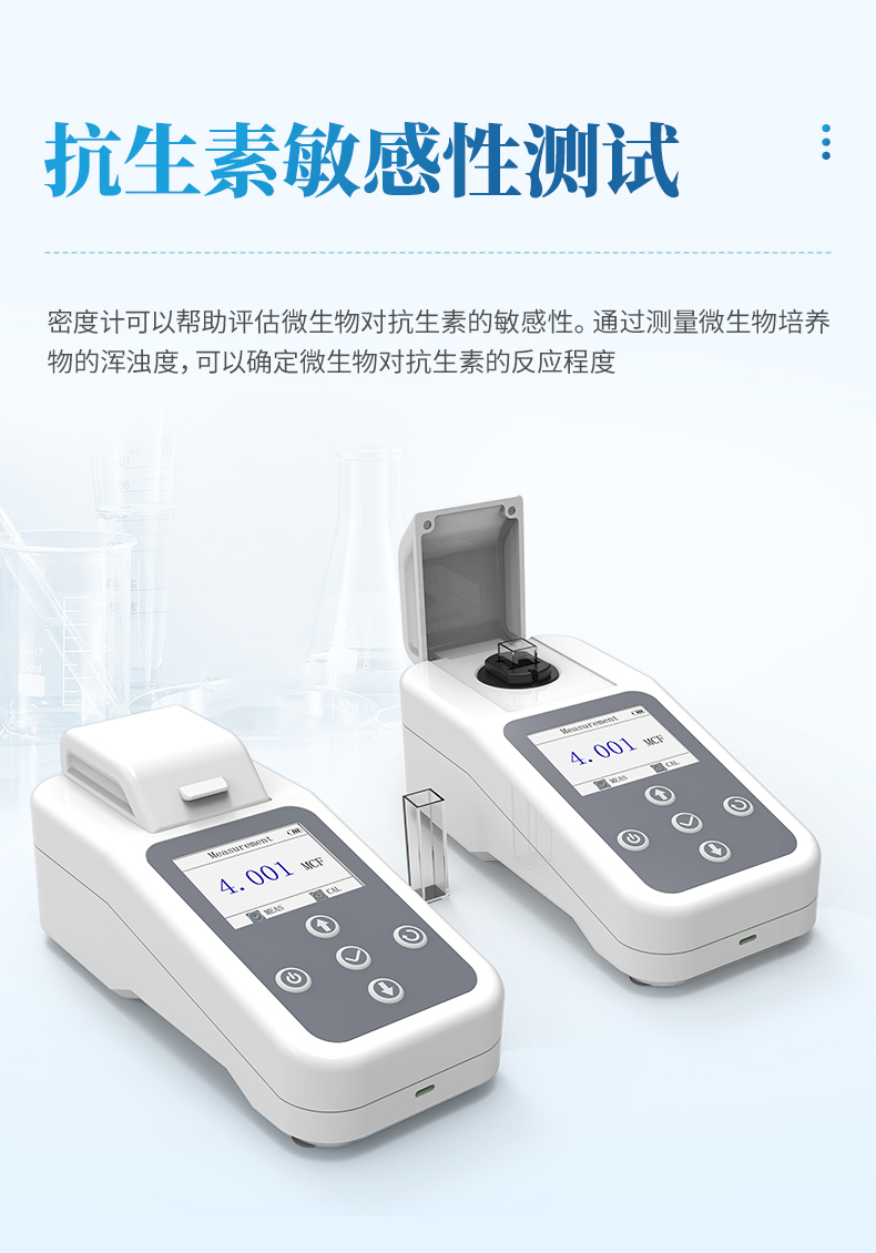 抗生素敏感性測試:密度計可以幫助評估微生物對抗生素的敏感性。通過測量微生物培養(yǎng)物的渾濁度,可以確定微生物對抗生素的反應(yīng)程度。