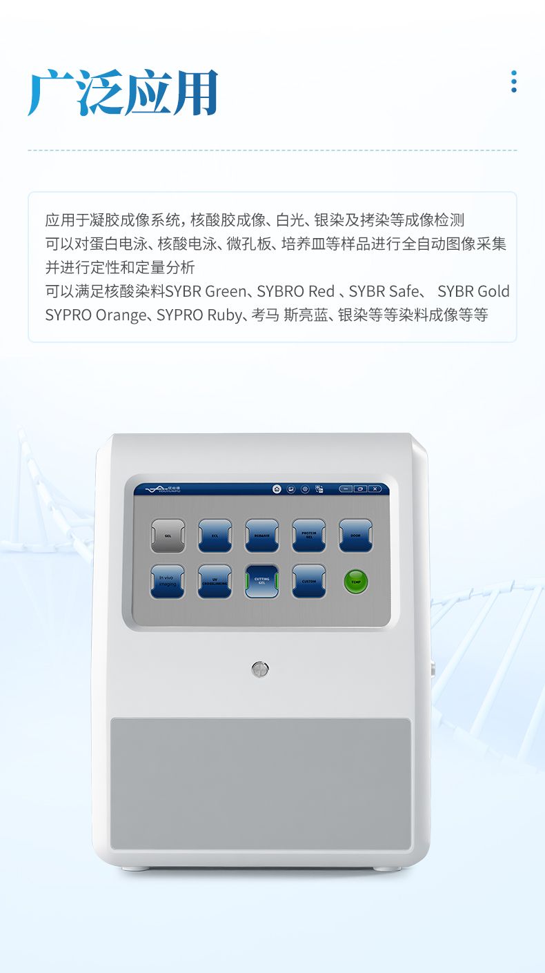 應(yīng)用于凝膠成像系統(tǒng),核酸膠成像、白光、銀染及拷染等成像檢測(cè)??梢詫?duì)蛋白電泳、核酸電泳、微孔板、培養(yǎng)皿等樣品進(jìn)行全自動(dòng)圖像采集并進(jìn)行定性和定量分析??梢詽M足核酸染 料 SYBR Green、SYBRO Red 、SYBR Safe、 SYBR Gold、SYPRO Orange、SYPRO Ruby、考馬 斯亮藍(lán)、銀染等等染料成像等等