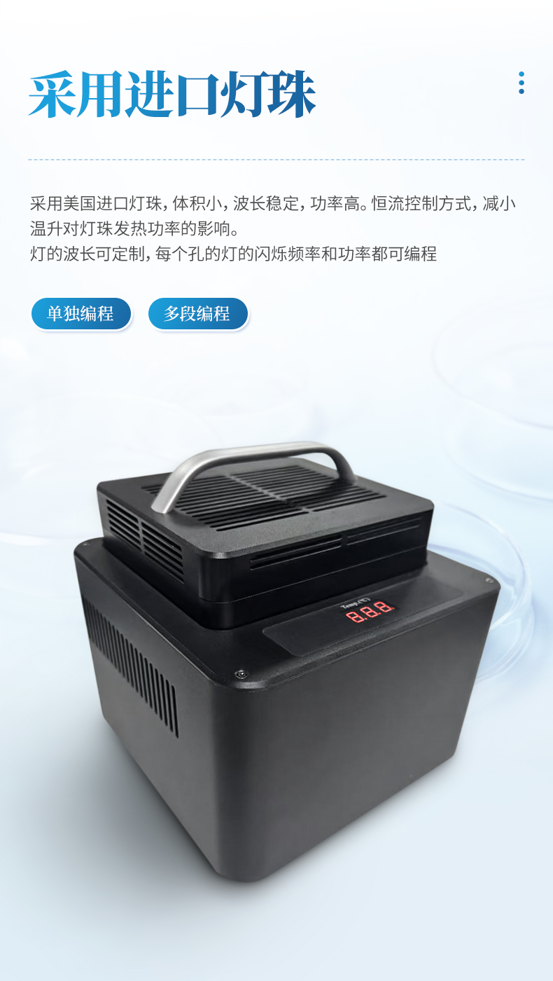 燈的波長可定制,每個孔的燈的閃爍頻率和功率都可單獨編程,并且支持多段編程。