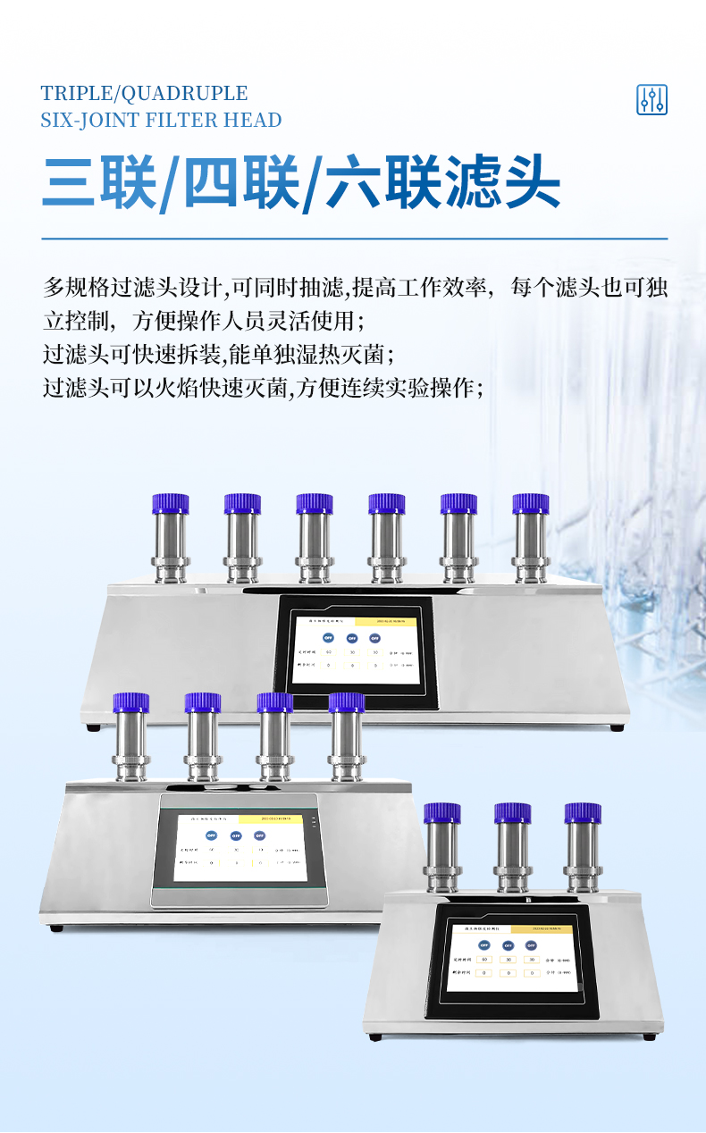 7.多規(guī)格過(guò)濾頭設(shè)計(jì),可同時(shí)抽濾,提高工作效率,每個(gè)濾頭也可獨(dú)立控制,方便操作人員靈活使用;